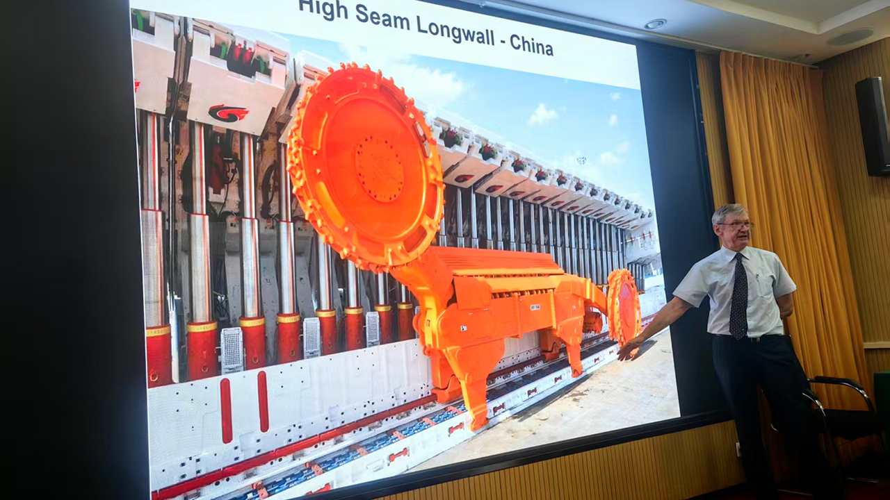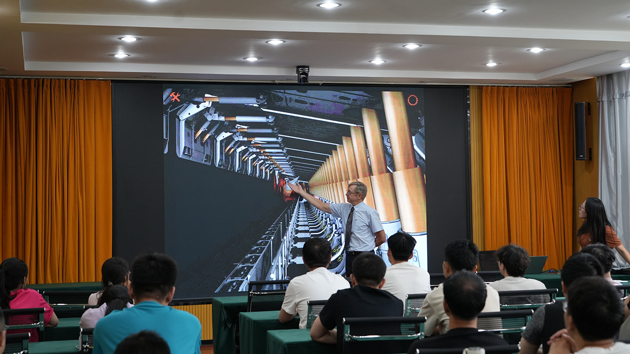 英国采矿协会会长Paul Freeman先生以“煤矿长壁开采及巷道掘进技术”为主题,结合其数十年来在矿业现场的丰富经验,讲解了长壁采煤作业中采煤机、液压支架及刮板输送机等关键装备的运作原理和优化配置策略。他介绍了巷道掘进设备如掘进机与连续采煤机的应用,并设计了模拟生产计算环节,引导同学们根据不同工况对采煤产量、收益与利润进行估算与对比,引发了员工的浓厚兴趣。讲座中,Freeman先生还回顾了个人从事矿业领域的发展历程,鼓励同学们积极投身科研实践,注重基础训练与国际交流融合,并充分利用当前中外合作平台,不断拓宽学术视野。