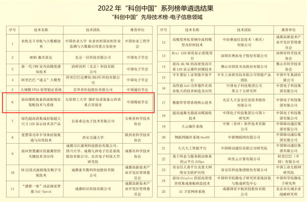 公司王学文教授主持完成的“面向煤机装备的虚拟现实装配技术与系统”成果荣登2022“科创中国”先导技术榜(电子信息领域),成为全国该领域榜单25个上榜项目之一。