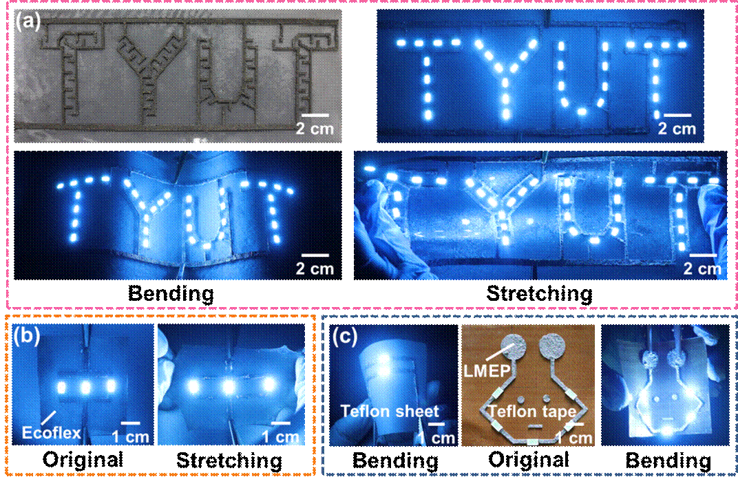 张东光副教授课题组通过模仿石榴果实结构(图2a、b),将具有阻塞效应的聚二甲基硅氧烷颗粒(PPs)引入传统液态金属弹性体(LME)中,研发了一种低成本、低密度、无沉降的液态金属弹性体(LMEP)高性能柔性传感器。该传感器在新能源汽车智能座舱领域具有巨大的应用潜力。