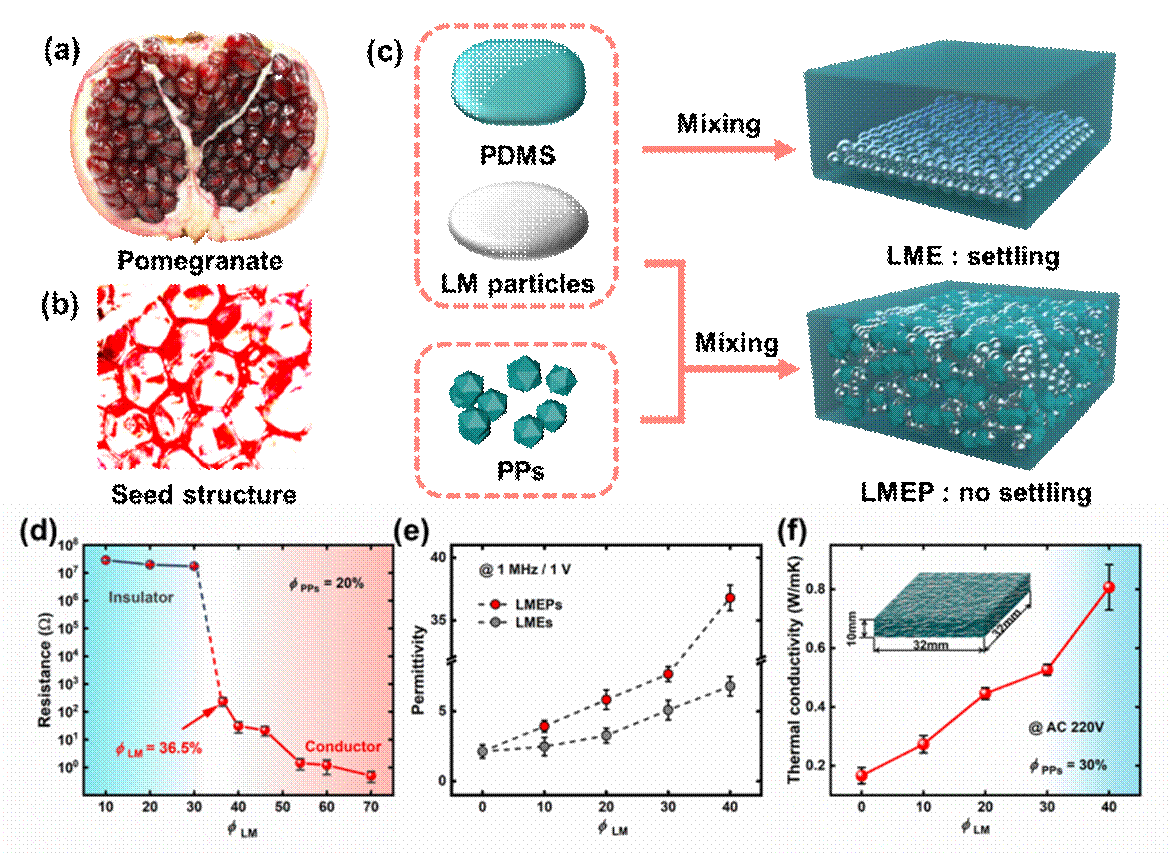 (a)石榴果实光学照;(b)石榴果实结构图;(c)LME和LMEP制备流程图;(d)fPPs=20%时,不同液态金属体积分数下LMEP的电阻值;(e)LMEs和LMEPs的介电常数曲线图;(f)fPPs=30%时,不同液态金属体积分数下LMEP的热导率