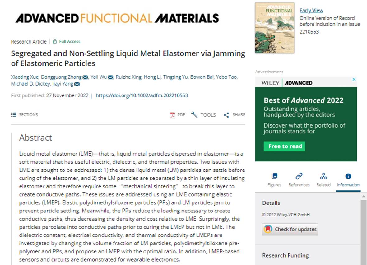 日前,公司张东光副教授课题组在新能源汽车智能传感研究领域取得重要研究进展,研究以“Segregated and Non-settling Liquid Metal Elastomer via Jamming of Elastomeric Particles”为题发表在国际顶级学术期刊《Advanced Functional Materials》(影响因子2021:19.924)。该论文的第一署名单位为PA视讯官方网站,研究生薛小婷为论文第一作者,张东光副教授、吴亚丽副教授、西安科技大学杨嘉怡副教授为论文共同通讯作者。