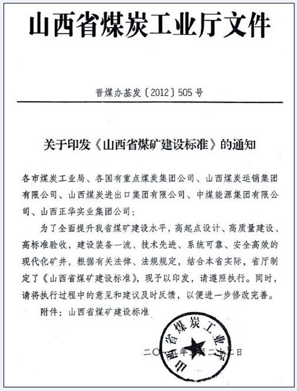 公司寇子明教授团队研究开发的“基于能量转换的矿用倾斜带式输送机防抱死安全制动关键技术”继2010年荣获国家技术发明二等奖之后,该技术又于2012年5月22日正式入选山西省煤矿建设标准。