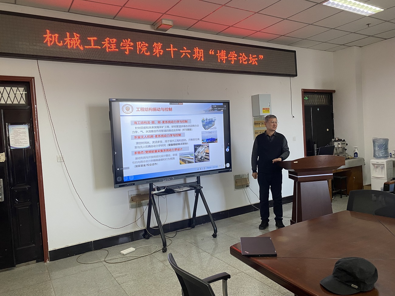 李国兴介绍了丁千教授的个人学术简历,对丁教授的到来表示热烈的欢迎。丁千教授是天津大学力学系教授,兼任教育部高校力学类专业教指委委员、中国力学学会常务理事、中国振动工程学会非线性振动专委会副主任委员,《力学进展》副主编。曾担任力学系和力学国家级实验教学示范中心(天津大学)主任,主讲理论力学、运动稳定性、振动力学课程并参编相关教材,获天津市教学成果特等奖和一等奖。从事动力学与控制研究,主持国家基金重点项目等,与航天、铁路装备、海上采油企业合作,开展结构动力学分析、设计和振动治理,获国家科技进步二等奖、天津市自然科学一等奖、中国力学学会自然科学奖二等奖。报告会中,丁千教授介绍了天津大学动力学与控制研究团队的研究方向,重点讲述近年来在周期超结构减振降噪设计与优化方面的工作。工程装备常处于多方向、宽频振动和噪声环境,且关键部件有承载要求,传统工程减振措施存在减振频带窄、多方向减振实现难、减振与支撑需求相矛盾等技术瓶颈。人工周期超结构是利用结构微单元与振动波的相互作用,自主调控、引导或阻止振动传播,实现减振降噪效果的新型功能结构。以具有振动能量聚集效应的声学黑洞构型(ABH)为主要微单元,丁千教授团队设计了多种周期超结构,并应用于航天发射、平台结构的减冲击和减振降噪中,还开展了基于数据驱动的动力学参数优化工作。