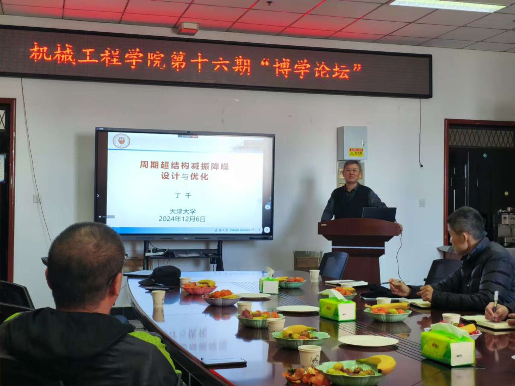 2024年12月6日,PA游戏官网入口特邀天津大学PA游戏官网入口丁千教授在逸夫楼505会议室做了题为“周期超结构减振降噪设计与优化”的学术报告。这是公司“博学论坛”系列学术报告的第16期。会议由李国兴副教授主持。公司科研骨干教师、部分博硕士研究生约40人参加报告会。