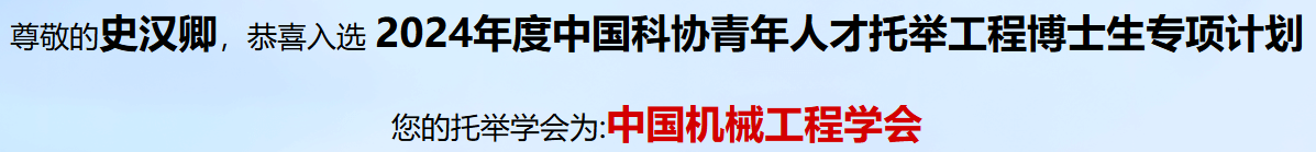 近日,中国科协公布了2024年度中国科协青年人才托举工程博士生专项计划入选者名单。黄庆公司士团队2021级博士研究生史汉卿成功入选,托举学会为中国机械工程学会。