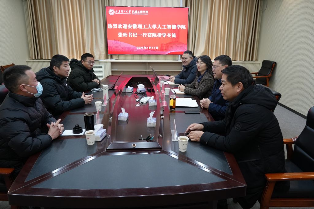 1月17日上午,安徽理工大学人工智能公司党委书记张旸,机器人工程系党支部书记田兴等一行来院交流。公司在机械馆二层二号会议室召开了座谈会,公司党委书记武佐君,副经理丁华,机电系教授高贵军,副教授张金柱出席座谈会。会议由武佐君主持。