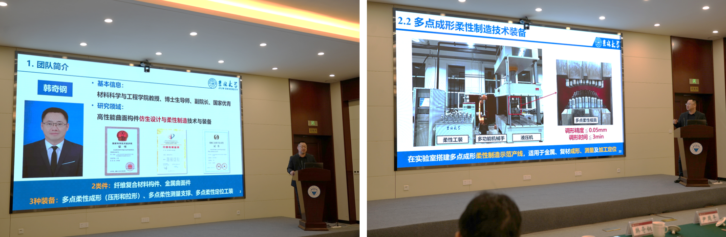 梁建国介绍了韩奇钢教授的个人简历,对韩教授的到来表示热烈的欢迎。韩奇钢教授是吉林大学材料科学与工程公司副经理、国家优秀青年基金获得者,兼任工程仿生国家地方联合工程实验室副主任、中国机械工程学会塑性工程分会委员、中国材料研究学会青年工作委员会理事等职务。长期从事仿生纤维复合材料多点成形制造原理、工艺与装备研究工作,获吉林省青年科技奖、机械工业科学技术发明一等奖、吉林省科学技术发明一等奖以及吉林省教学成果特等奖。韩奇钢教授的报告题目是“仿生纤维复合材料多点成形制造”,介绍了团队在仿生纤维复合材料多点成形制造方向的研究工作进展,重点讲述了设计制造的多种新型仿生纤维复合材料构件,及其在航空航天、轨道交通、新能源汽车等领域作为结构与功能构件的应用实例。