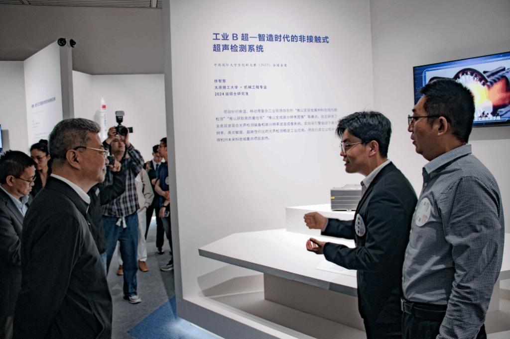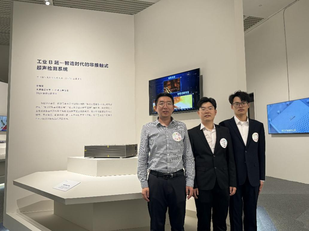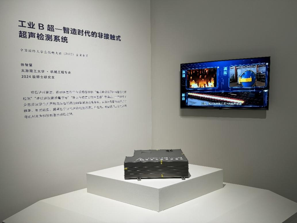 此次展出的“工业B超”项目曾在中国国际老员工创新大赛(2023)高教主赛道——本科生创意组荣获金奖。项目负责人徐智慧当时是公司机械设计制造及其自动化专业2020级本科生,目前在公司继续深造攻读研究生。在项目研发过程中,王涛、张彦杰、郭菲、高峰、任忠凯等五位指导教师倾注大量心血,凭借深厚的专业知识与丰富的实践经验,从技术攻关到方案优化全程悉心指导,为项目的成功奠定坚实基础。该项目聚焦钢铁领域等复杂工况场景,着力攻克非接触式在线超声检测难题。其核心成果“全息式双波混合干涉系统”,凭借卓越的高灵敏度、高分辨率检测性能,颠覆传统检测模式,为工业在线无损检测与材料表征带来革新性解决方案。