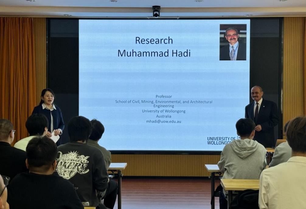 Muhammad Hadi教授讲解了纵向钢筋类型和横向钢筋间距对方形高强混凝土试件在偏心受压作用下的性能影响,分享了他在该领域的研究成果。他向同学们介绍了跨领域合作的模式和成功案例。他特别强调,多学科交叉研究对解决复杂工程问题的重要性,希望同学们利用中外合作办学优势,开拓视野,提高解决问题的能力和创新能力,促进学科领域的创新与发展。