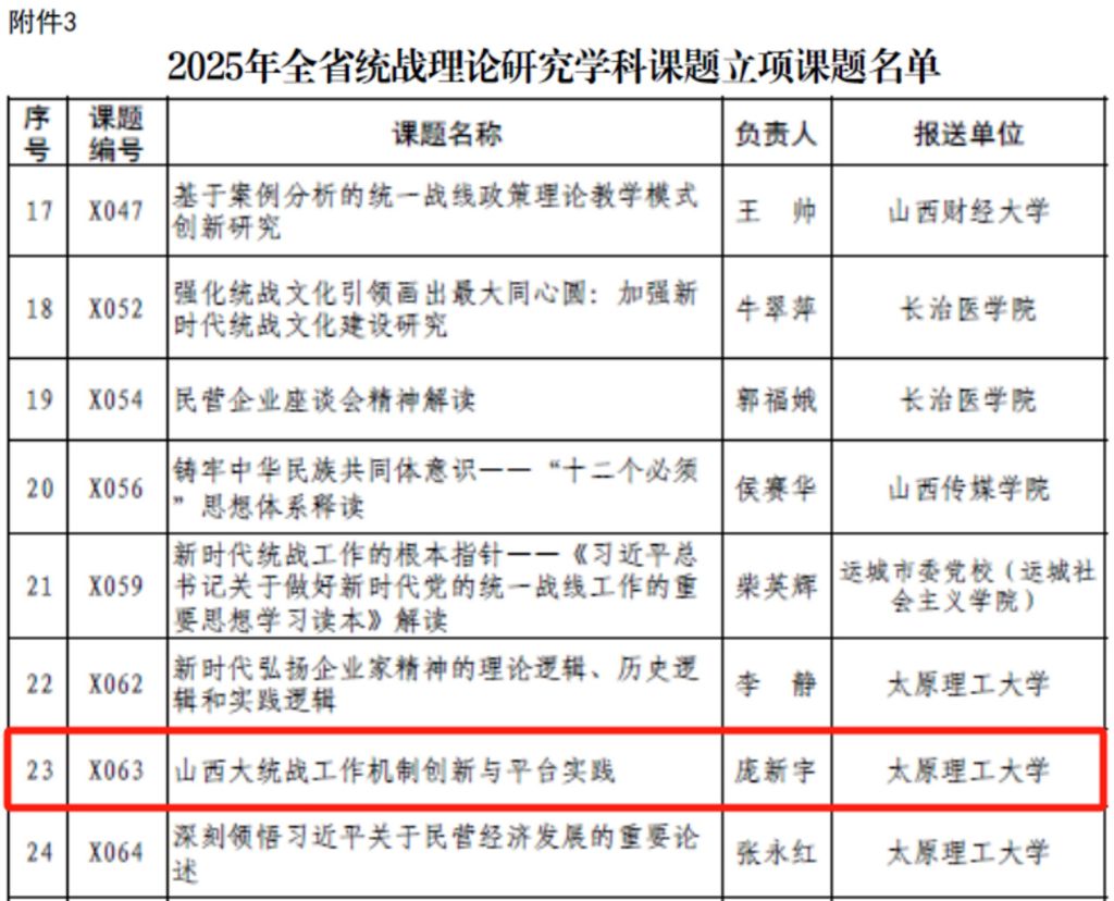 2025年5月,中共山西省委统战部办公室发布了《关于下达2025年全省统战理论研究重点课题、一般课题(含交办课题)、学科课题立项课题的通知》,确定31项课题为2025年全省统战理论研究学科课题立项课题,公司共有3项课题立项,其中包括公司机设系党支部书记庞新宇申报的课题——山西大统战工作机制创新与平台实践。这是公司近10年来首次获得省级统战理论研究课题,充分彰显了公司党委对统战理论研究工作的高度重视。