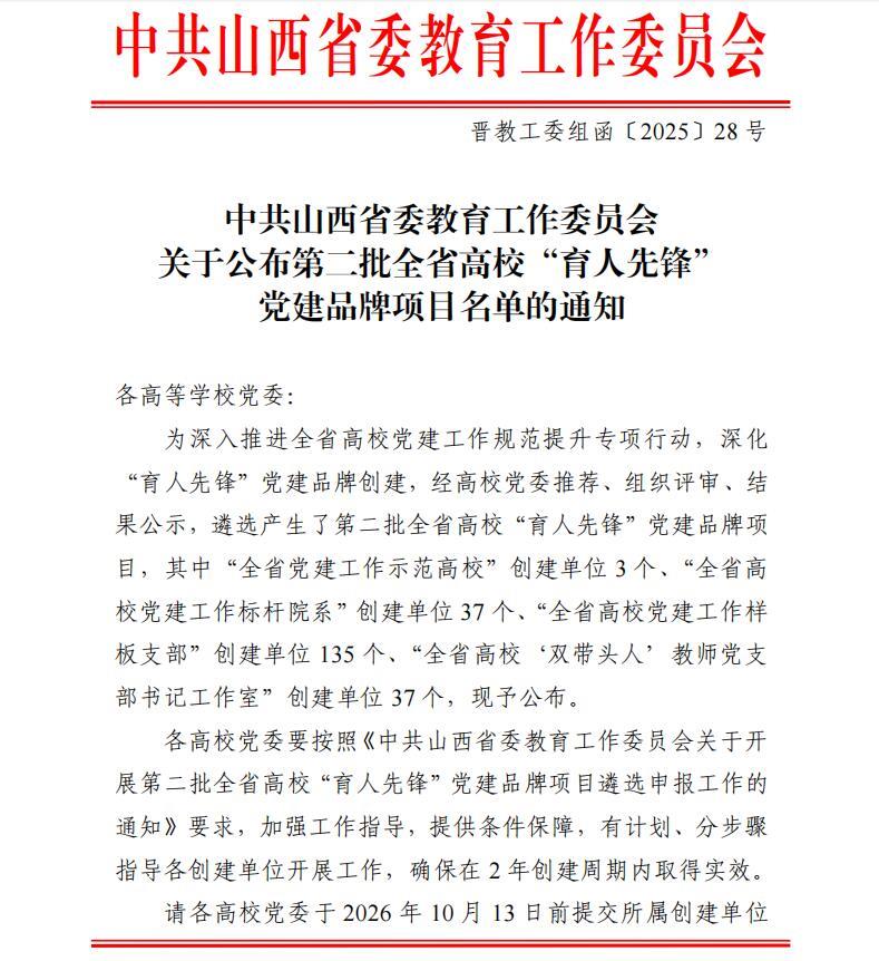 近日,省委教育工委正式公布了第二批全省高校“育人先锋”党建品牌项目名单,公司再获佳绩,共有2个项目成功入选。