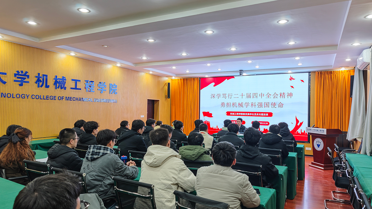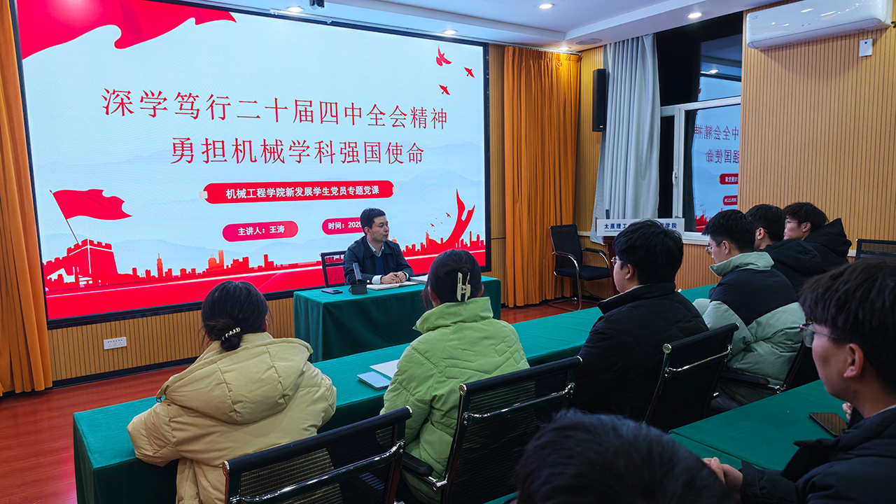 为深入学习贯彻党的二十届四中全会精神,加强研究生党员理想信念教育,11月24日,PA游戏官网入口经理王涛教授在机械馆二层大会议室,以“深学笃行党的二十届四中全会精神 勇担机械学科强国使命”为主题,为新发展研究生党员讲授专题党课。