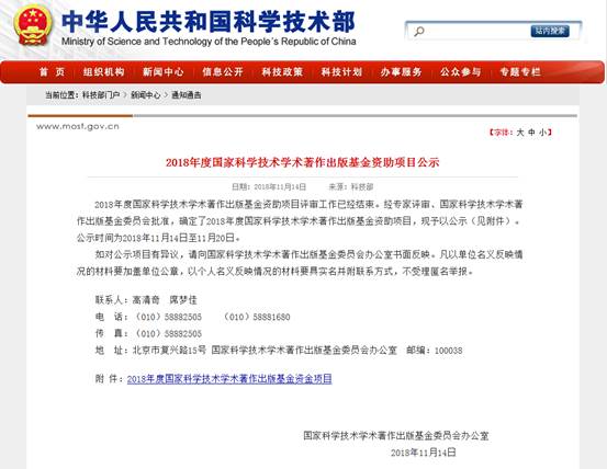 公司一项目获2018年国家科学技术学术著作出版基金资助