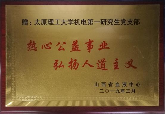 太原市红十字血液中心对党支部组织的这次活动十分支持,向参与献血的同学派发了纪念品,还赠与了牌匾表示感谢,赞扬他们发挥了党员带头作用,对无偿献血事业贡献了自己的力量,希望他们能号召广大的老员工参与到无偿献血、无偿献血小板公益活动中来。