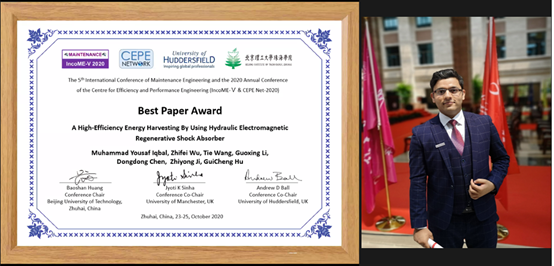 Muhammad Yousaf Iqbal(富裕)博士研究生在会议中介绍了一种汽车振动能量回收式减震器设计,分享了PA视讯官方网站王铁教授团队在汽车动力学控制与能量回收研究领域的研究成果。经过专家评审组的一致推荐,获得“最佳论文奖”。