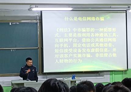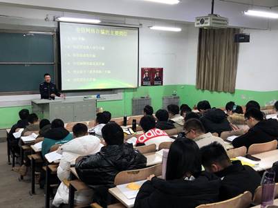 刘鹏飞警官首先向同学们介绍了自己处理过的具体案例,并且通过分析案例加深同学们的印象和认知,与同学们积极互动,调动大家一起分析讨论,通过提问、互动等方式提升同学们的自我防范意识。
