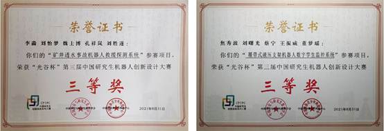 经过作品视频展示评审,线上分组答辩评审等环节的激烈角逐,公司黄庆公司士团队的“TFB(tyut force robot)”战队设计完成的“矿井透水事故机器人救援探测系统”获得仿真组三等奖;王学文教授团队的 “黑金VIP”战队设计完成的“履带式液压支架机器人数字孪生监控系统”获得集成组三等奖。