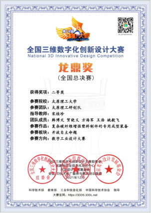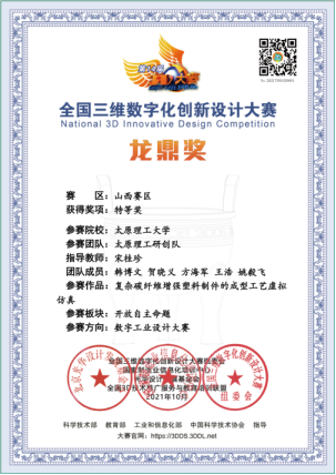 2021第14届全国三维数字化创新设计大赛首次设置研究生组。由于疫情的原因,本届大赛在线上进行。从2021年5月起,至2021年12月,经网络海选、初赛、赛区复赛、全国总决赛四个阶段。宋桂珍老师指导的参赛作品“复杂碳纤维增强塑料制件的成型工艺虚拟仿真”,在山西赛区(包括晋蒙秦三地)353项复赛作品中荣获特等奖,成功晋级全国总决赛;作品“复杂碳纤维增强塑料制件的专用成型装备”在800支决赛队伍的激烈角逐中荣获全国总决赛二等奖。