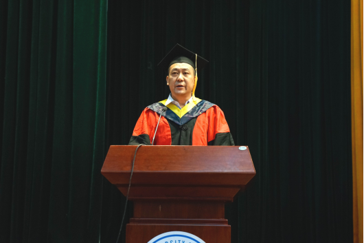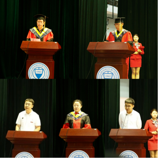 副经理熊晓燕宣读《关于授予2023届博士、硕士、学士学位的决定》。副经理赵敬伟宣读《关于表彰2023届优秀毕业生的决定》。公司为优秀毕业生颁发荣誉证书并赠送“星光台”,希望受到表彰的同学们继续发挥先锋模范作用。马国祯老师作为教师代表发言,鼓励毕业生们将基础研究和工程技术结合,从工程角度造福国计民生。2019级博士生张晶晶、机电1908班裴智明同学代表全体2023届毕业生发言,表达对母校和公司的感恩之情,表示在今后的学习和生活中要踔厉奋发,挺膺担当。
