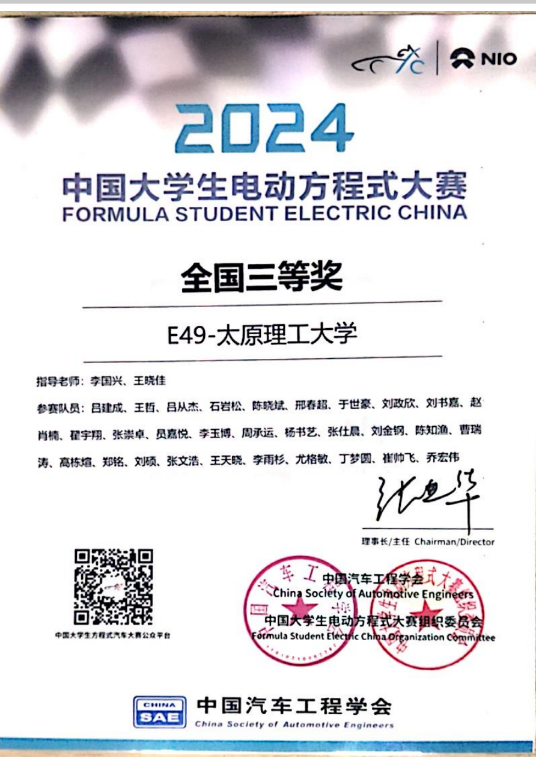 公司晋翔车队在10月底结束的两项实车参赛的比赛中取得佳绩,荣获2024“蔚来杯”中国老员工电动方程式大赛(FSEC)国家三等奖,荣获2024壳牌汽车环保马拉松中国赛最佳外观奖。比赛由王晓佳、李国兴老师带队。