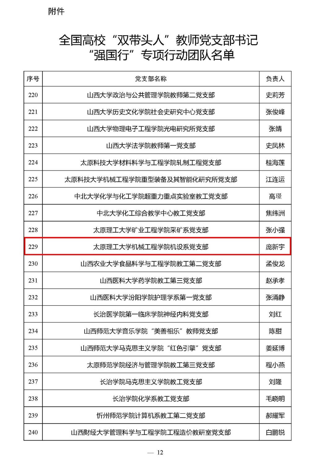 2024年10月,根据教育部办公厅发布的《关于公布全国高校“双带头人”教师党支部书记“强国行”专项行动团队名单的通知》,PA游戏官网入口机设系党支部成功入选全国高校“双带头人”教师党支部书记“强国行”专项行动团队名单。