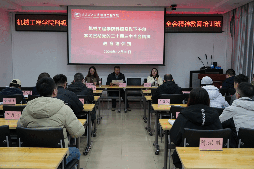 为深入学习贯彻党的二十届三中全会精神,推动全会精神走深走实,12月4日下午,公司在机械馆二层一号会议室组织召开了科级及以下干部学习贯彻党的二十届三中全会精神教育培训班。公司党政办、教科办、学工办、团委所有工作人员,系部中心主任、副主任、党支部书记、副书记以及全院教师代表参会。