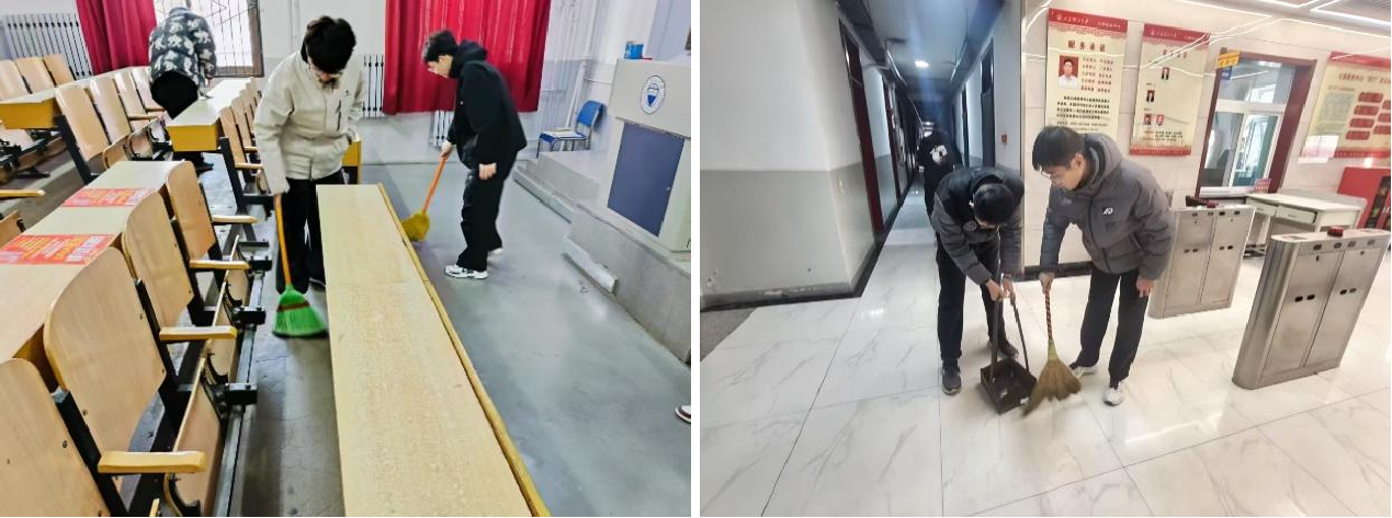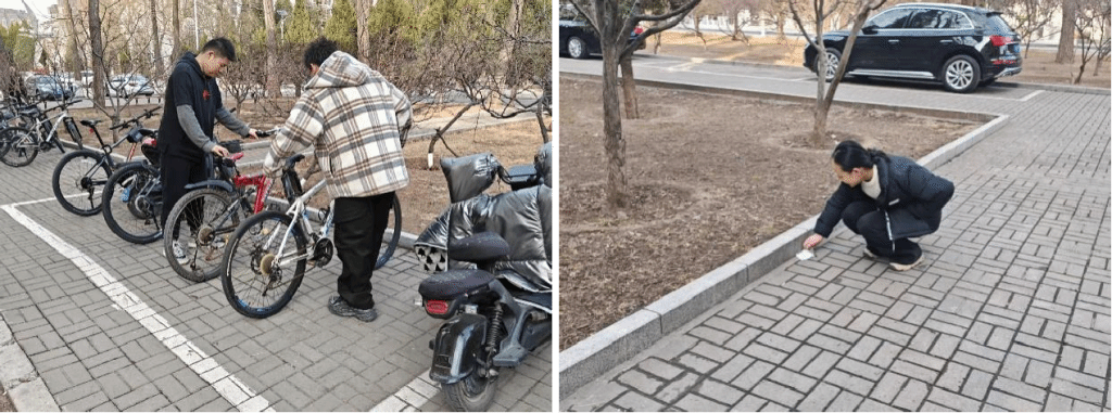 支部成员分成七个小组,各自领取任务并迅速投入行动。第一小组在宿舍楼下整理摆放自行车,他们将东倒西歪的自行车整齐排列,确保通道畅通无阻;第二小组前往机械馆周围,认真清理隐藏在角落的垃圾,不放过任何一处卫生死角;第三小组负责打扫宿舍楼道卫生,擦拭栏杆、清扫地面,让楼道焕然一新;第四小组在操场捡拾垃圾,为同学们创造干净舒适的运动环境;第五小组则对机械馆空闲教室进行全面清洁,整理桌椅、擦洗黑板,为后续使用做好准备;第六小组整理摆放机械馆周围自行车,规范停车秩序;第七小组在清泽园清除杂草和垃圾,还原园区整洁风貌。