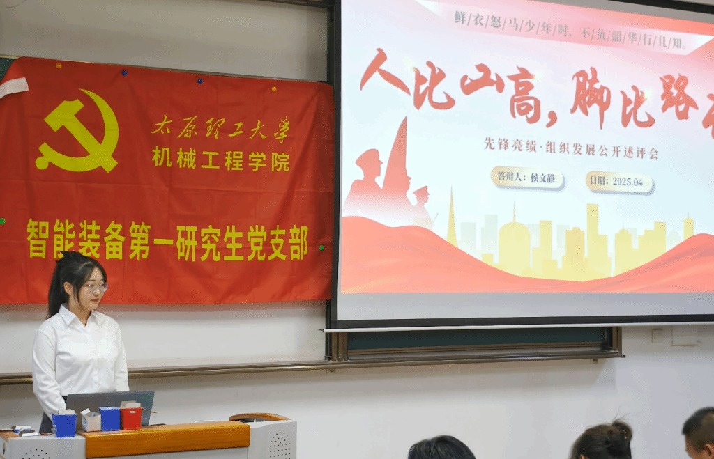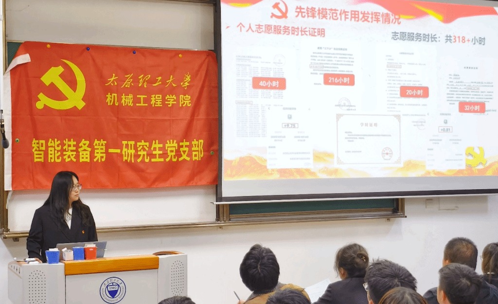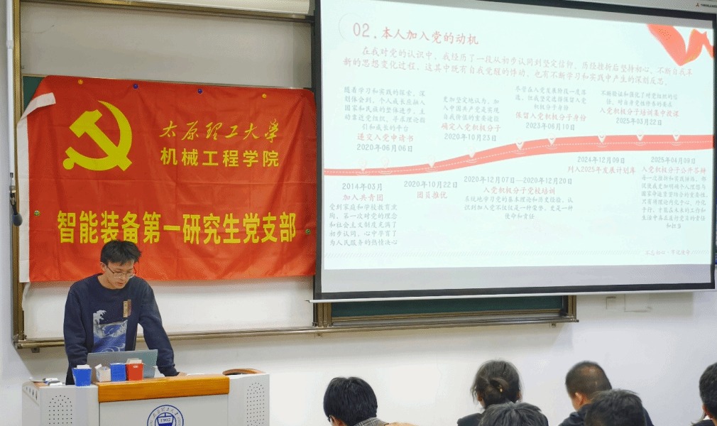 为增强基层党组织的政治功能和组织功能,坚持用改革精神和严的标准推进党员队伍建设,进一步强化基层党组织在群众中的战斗堡垒作用,持续锻造靠得住、顶得上、过得硬的先锋模范队伍,智能装备第一研究生党支部于2025年4月9日19:00在逸夫楼101教室召开了“先锋亮绩·组织发展公开述评会”。