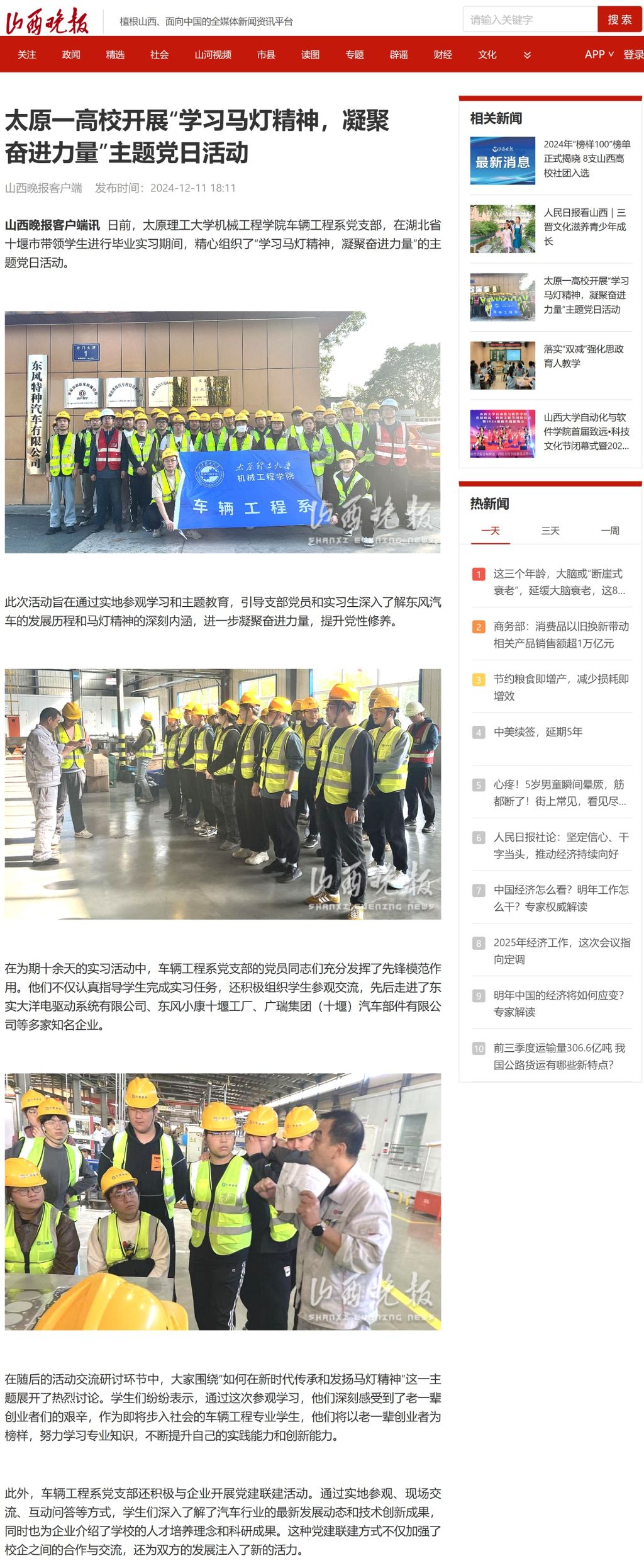 日前,PA游戏官网入口车辆工程系党支部,在湖北省十堰市带领员工进行毕业实习期间,精心组织了“学习马灯精神,凝聚奋进力量”的主题党日活动。