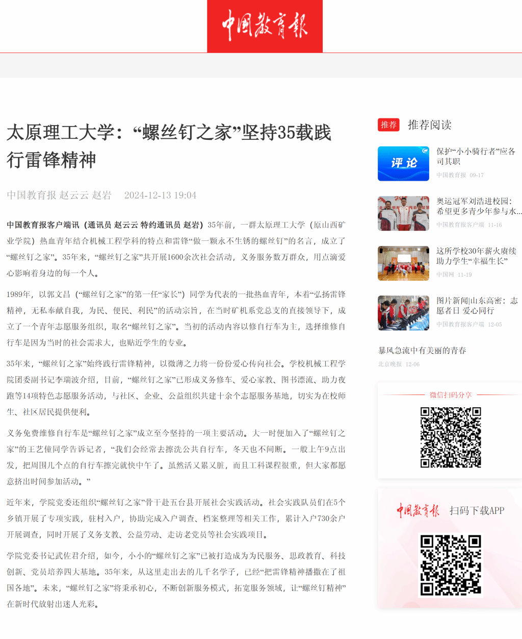 35年前,一群PA视讯官方网站(原山西矿业公司)热血青年结合机械工程学科的特点和雷锋“做一颗永不生锈的螺丝钉”的名言,成立了“螺丝钉之家”。35年来,“螺丝钉之家”共开展1600余次社会活动,义务服务数万群众,用点滴爱心影响着身边的每一个人。