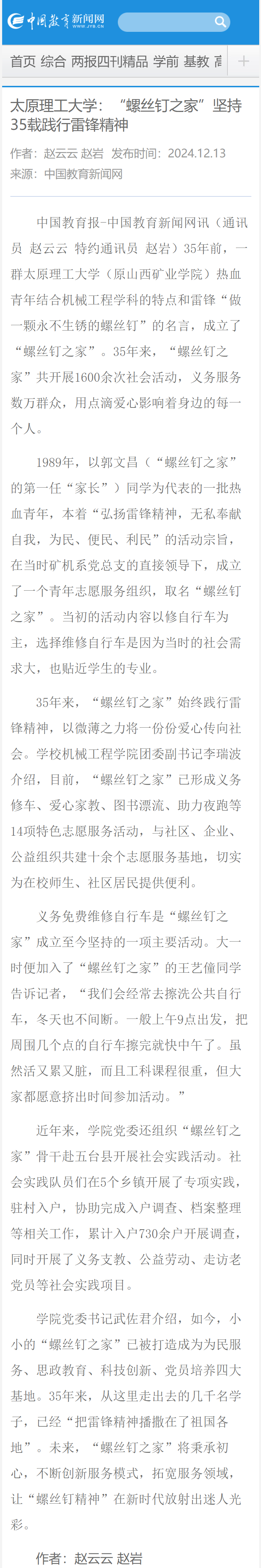 公司党委书记武佐君介绍,如今,小小的“螺丝钉之家”已被打造成为为民服务、思政教育、科技创新、党员培养四大基地。35年来,从这里走出去的几千名学子,已经“把雷锋精神播撒在了祖国各地”。未来,“螺丝钉之家”将秉承初心,不断创新服务模式,拓宽服务领域,让“螺丝钉精神”在新时代放射出迷人光彩。