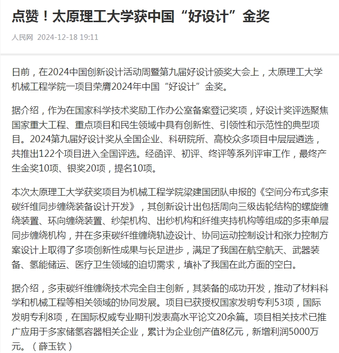 据介绍,多束碳纤维缠绕技术完全自主创新,其装备的成功开发,推动了材料科学和机械工程等相关领域的协同发展。项目已获授权国家发明专利53项,国际发明专利8项,在国际权威专业期刊发表高水平论文20余篇。项目相关技术已推广应用于多家储氢容器相关企业,累计为企业创产值8亿元,新增利润5000万元。
