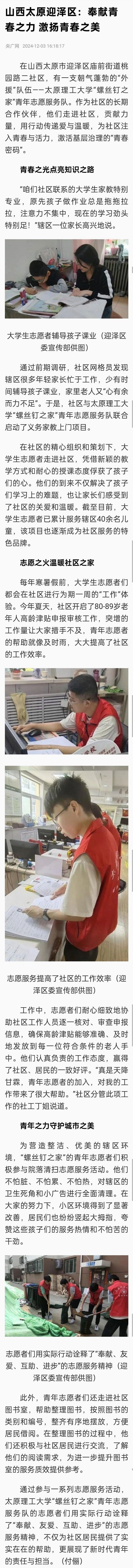 山西太原迎泽区:奉献青春之力 激扬青春之美