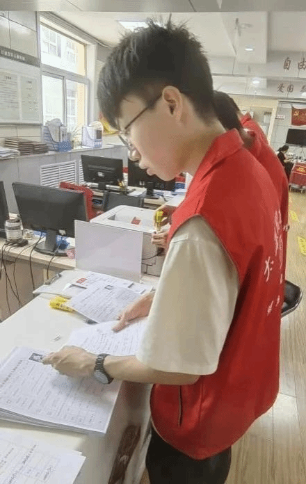 每年寒暑假前,老员工志愿者们都会在社区进行为期一周的“工作”体验。今年夏天,社区开启了80-89岁老年人高龄津贴申报审核工作,突增的工作量让大家措手不及,青年志愿者的帮助就像及时雨,大大提高了社区的工作效率。